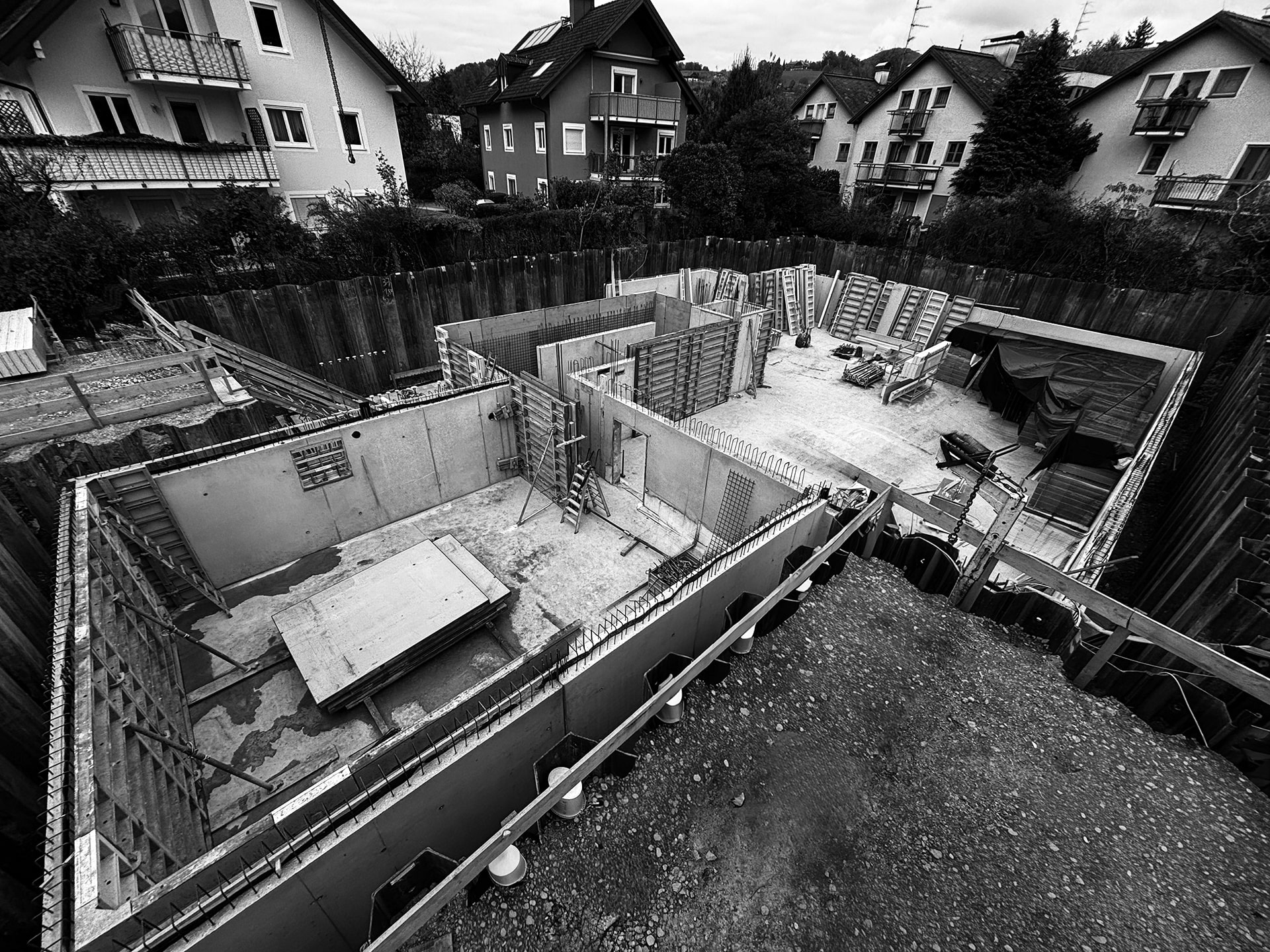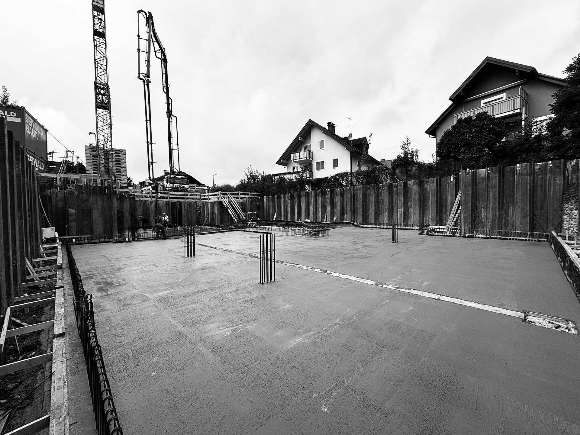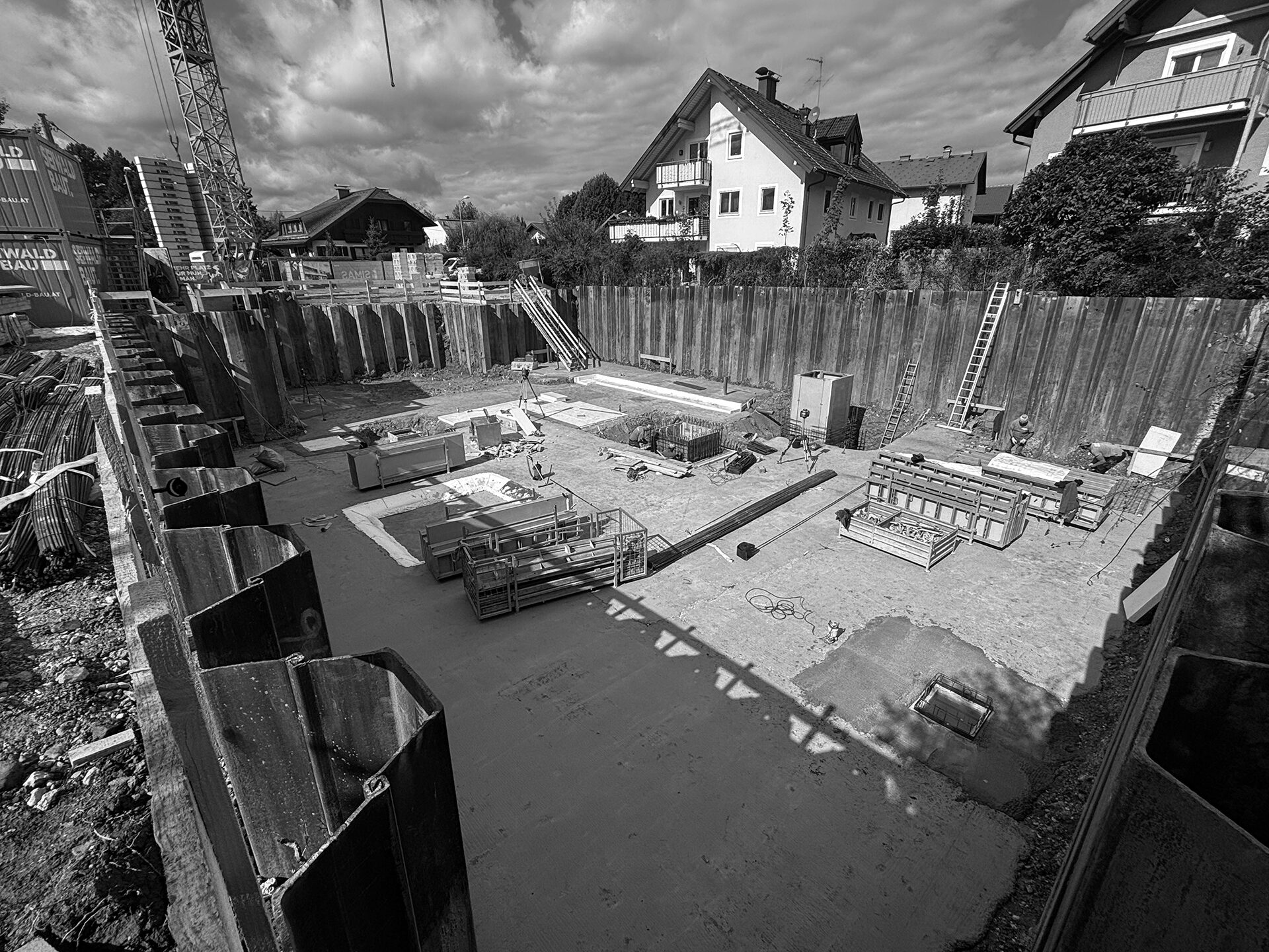 Das Bild zeigt, wie die Sauberkeitsschicht der Baustelle „P 33“ in Salzburg ihre Ruhe und Ordnung gewonnen hat. Die glatte Oberfläche des Magerbetons strahlt Klarheit aus – ein sichtbares Fundament, auf dem die nächsten Bauphasen aufbauen werden. Jeder Handgriff, jede Verdichtung und jedes Abziehen des Betons hat dazu beigetragen, dass die Fläche nicht nur stabil, sondern auch ästhetisch ebenmäßig ist. Die rohe Erde von gestern ist einer klaren, strukturierten Basis gewichen, die bereit ist, die zukünftige Bodenplatte sicher zu tragen. Die Sauberkeitsschicht ist mehr als nur Technik: Sie ist der erste physische Ausdruck des Bauprojekts, der sichtbare Schritt vom Rohboden hin zu einem geordneten, tragfähigen Fundament. Auf dem Foto wirkt die Fläche ruhig, fast meditativ – ein Moment eingefangen, der zeigt, dass selbst in der frühen Bauphase Präzision, Sorgfalt und Weitsicht Hand in Hand gehen. Mit diesem Bild halten wir fest, dass die Baustelle bereit ist, weiter zu wachsen – Schritt für Schritt, Schicht für Schicht.